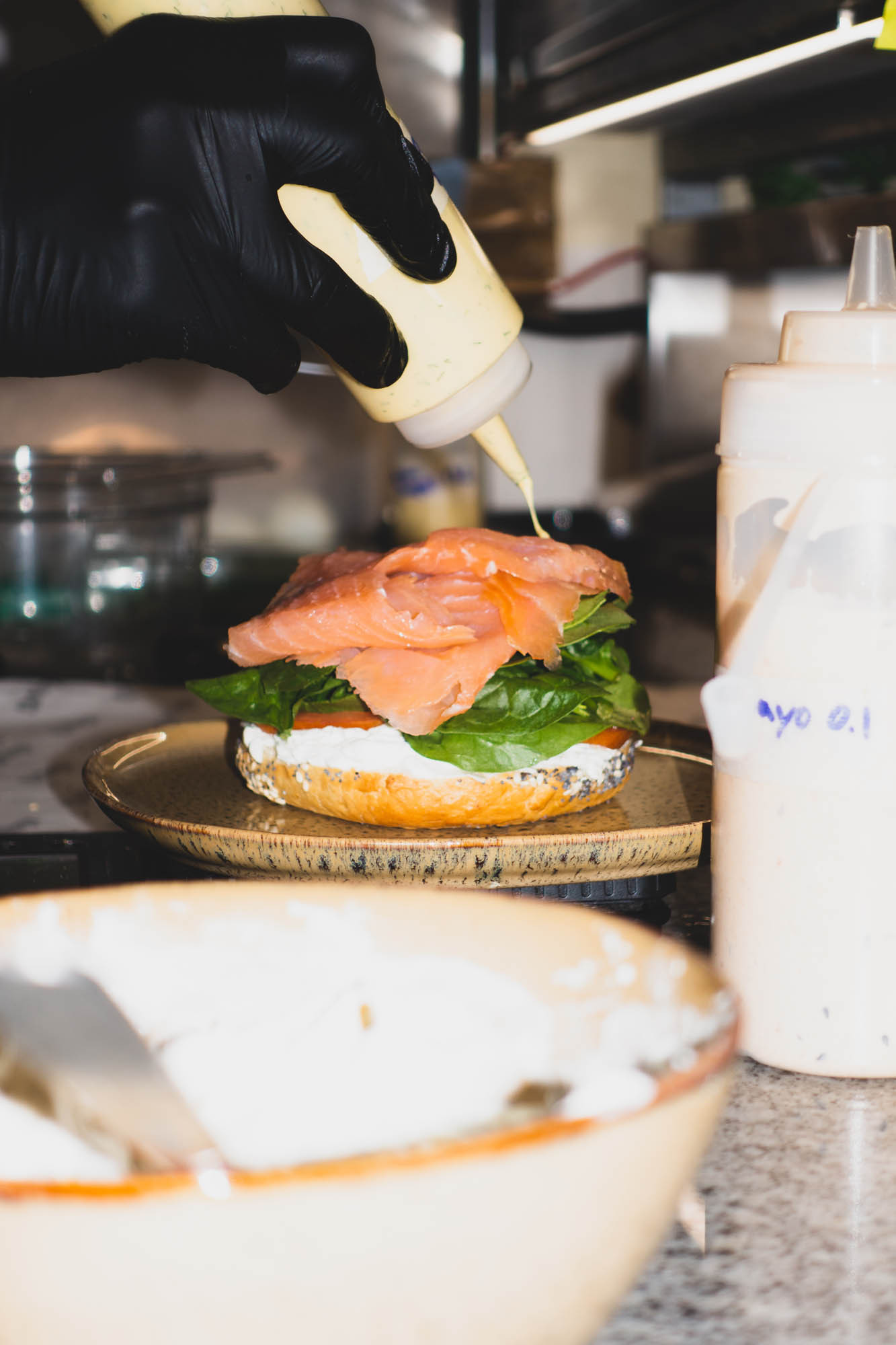Queso crema, alcaparras, tomate fresco, espinacas, salmón ahumado, salsa de miel y mostaza de la casa, cebolla encurtida
